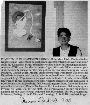 Meine 1. Ausstellung mit dem Titel "Frauenbilder" findet im Frauenzentrum Regensburg statt. Gezeigt wurde damals die Reihe des "Feministischen Konkretismus". |