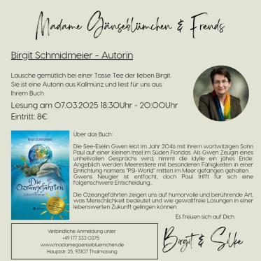 Lesung aus meinem Zukunftsroman "Die Ozeangefährten". Eintritt 5 €. https://www.madamegaensebluemchen.com/ |