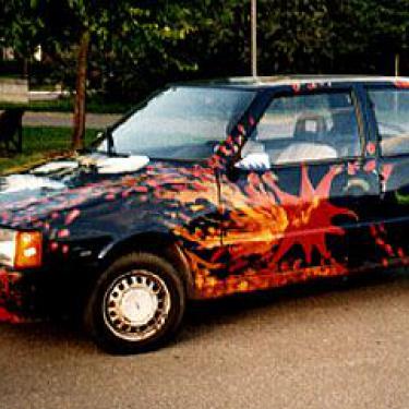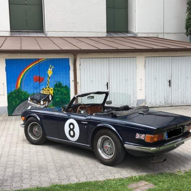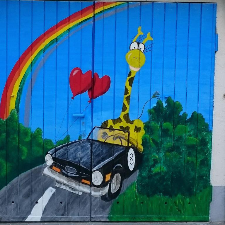 Ja, Jeanny, die Giraffe, taucht auf dieser Webseite noch an zwei anderen Stellen auf (Wandbild und Comic). Nachdem sie mittlerweile "trocken" ist, braust sie gerne mit Josy, dem schnittigen Triumph-Cabrio-ClassicCar aus dem besonders tollen Jahrgang 1973, durch die Gegend. Das Bildnis ziert nun Josys Garage und ist Blickfang in einem Münchner Hinterhof.