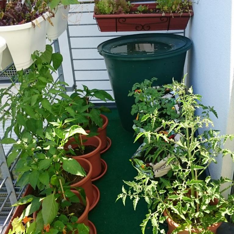 Alles wächst und gedeiht. Einmal habe ich zwischendurch mit selbstgemachter Brennesseljauche gedüngt. Der Deckel auf dem Erdtopf (manche würden es zweckentfremden und als Regentonne verwenden...) dient auch als Tränke für Vögel und Insekten.