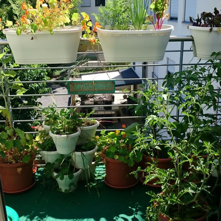 In 2018 habe ich 25 essbare Sorten geerntet: Salbei, Rosmarin, Zitronenmelisse (die drei sind die einzig gekauften Pflanzen), Radieschen, Pflücksalat, Ruccola, Spinat, Mangold, Walderdbeeren, Frühlingszwiebel, Rote Zwiebel, Lauch, Karotten, Gurken, Stangenbohnen, Paprika Frühzauber, Peperoni Sweet Banana, Chili Elefantenrüssel, Rote Beete, Knoblauch, Physalis, Tomaten, Kapuzinerkresse, Buschbohnen und Kartoffeln, sowie ein Bonuskasten mit Schmetterlings- und Bienenblumen.