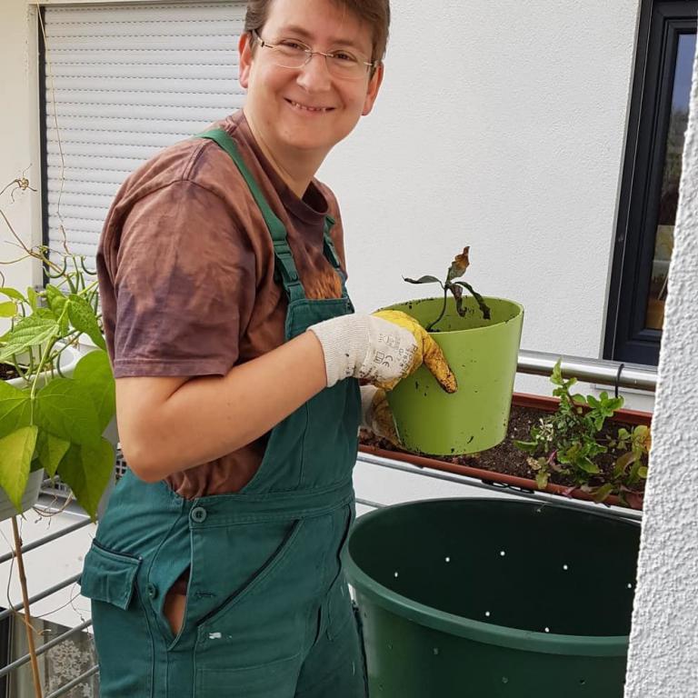 2. Komposthaufen braucht man nicht. Frau packt das restliche Grünzeug unten in die neu aufbereiten Töpfe, in die dann gleich gesät oder gepflanzt wird.
