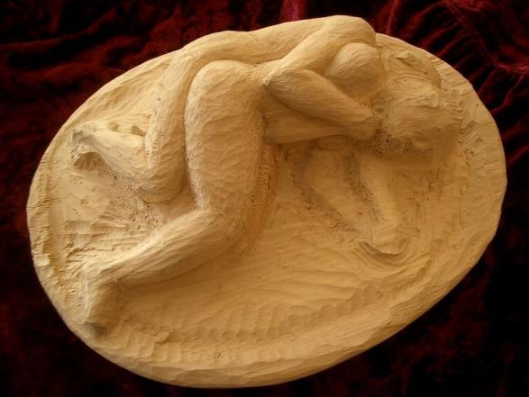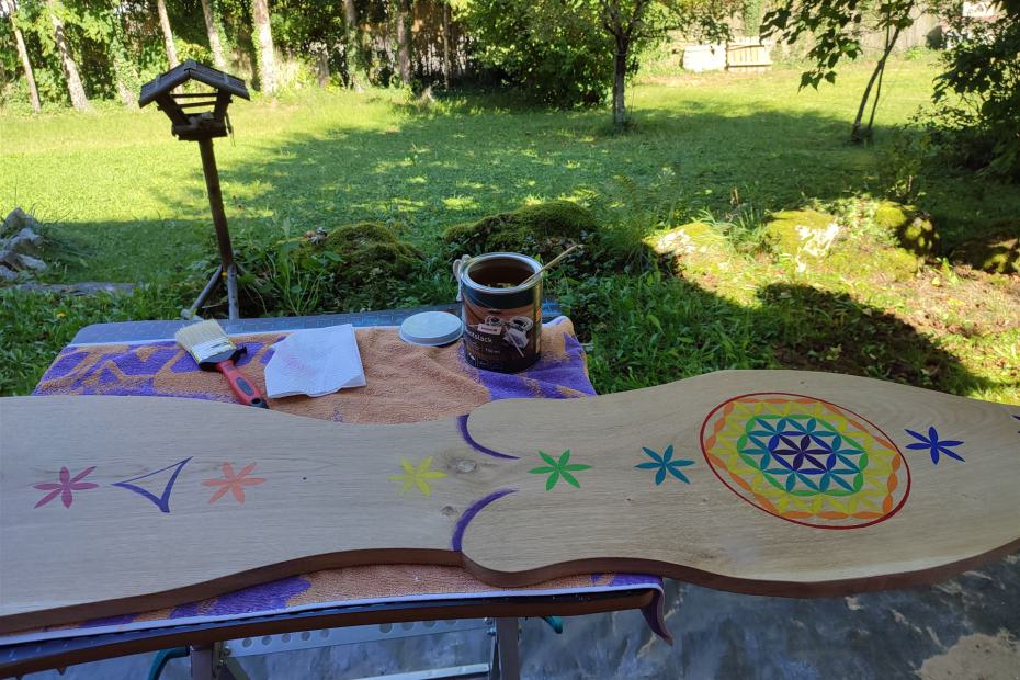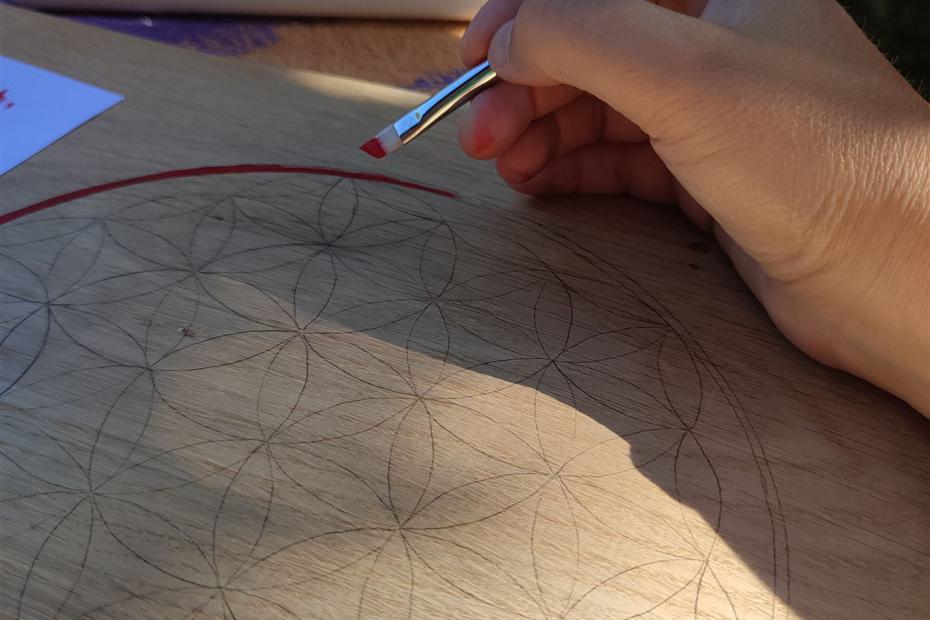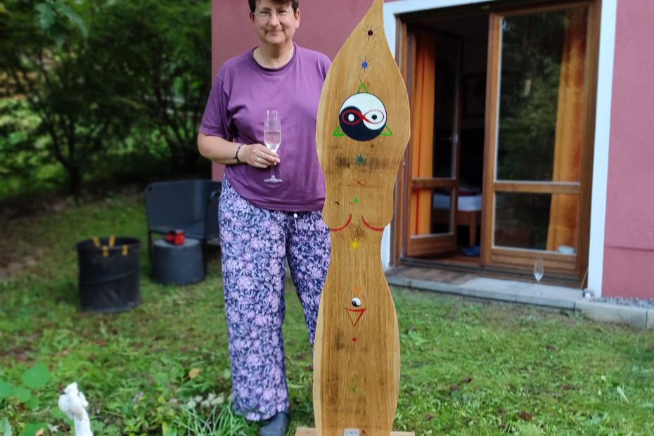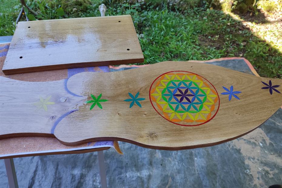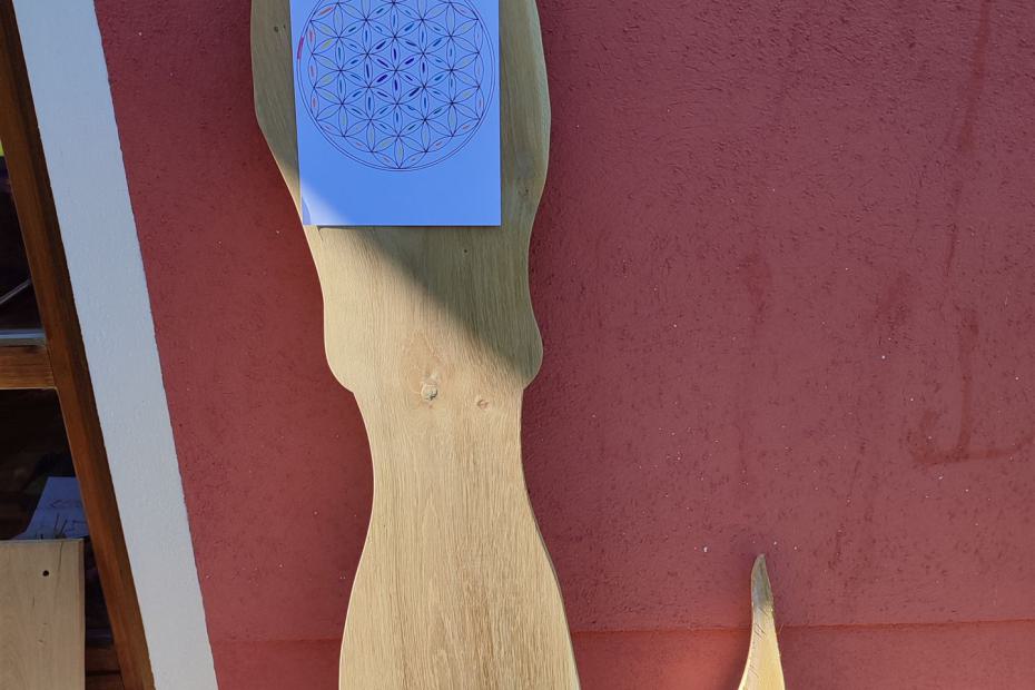Spirituelle Symbole, insbesondere die Blume des Lebens und mein Tattoo aus keltischem Knoten (Triskele), Yin und Yang und der Ewigkeitsschleife, sowie jeweils den sieben farbigen Chakren (Energiezentren des Körpers). Vorder- und Rückseite des Bretts symbolisieren je eine Frau, die in der Skulptur vereint sind.