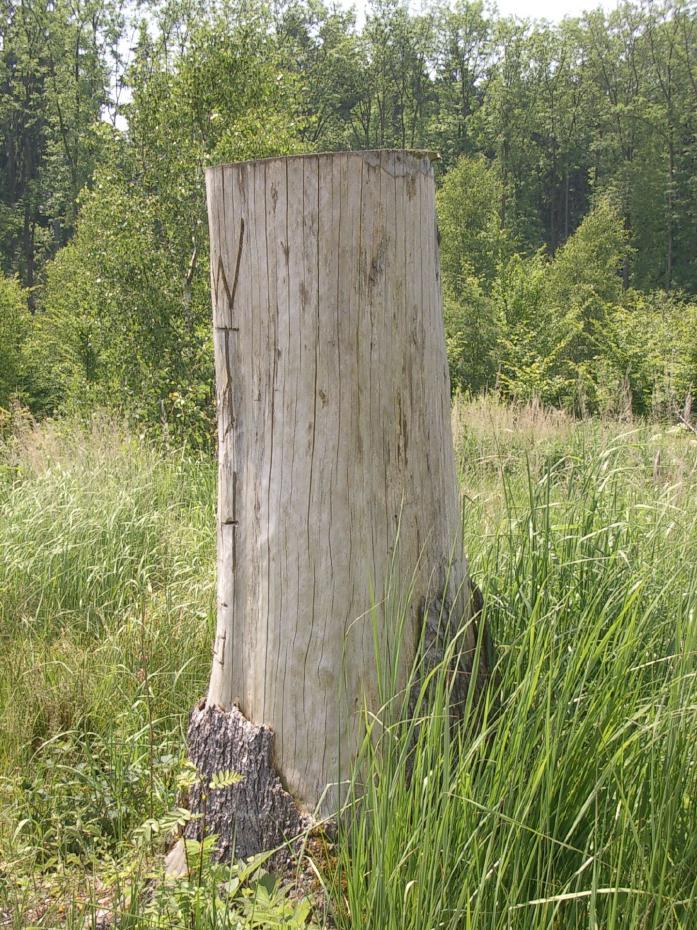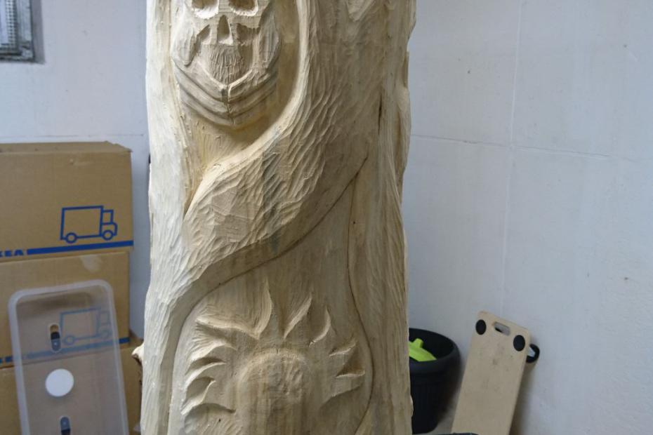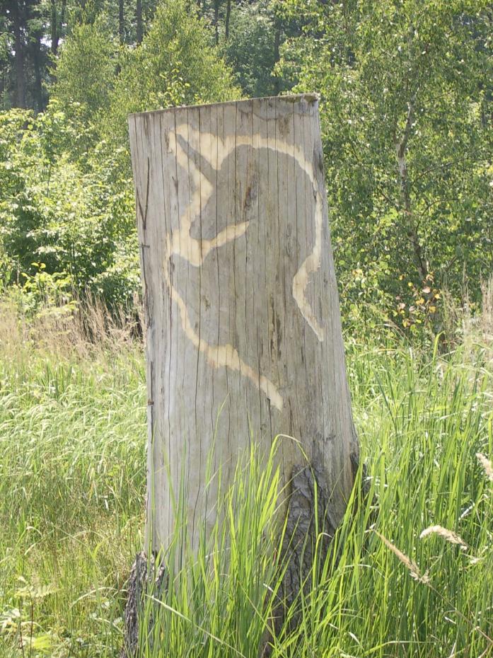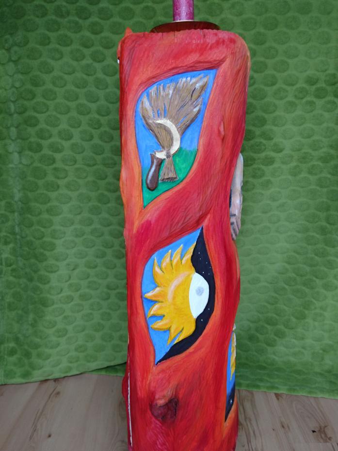 Das Interagieren mit diesem gewachsenen Material brachte mir in den letzten fünf Monaten erstaunliche Erkenntnisse. Bereits kurze Zeit nach dem Entrinden zeigten sich die ersten Risse längs am Stamm. Rechts neben dem Walpurgis-Besen sollte gleich die Sichel und das Getreidebüschel Platz finden. Allerdings ging an dieser Stelle der breiteste Riss bereits durch die ganz Länge des Stammes und schränkte den vorhandenen Platz erheblich ein. Nach einigem Grübeln brachte ich das Sichelbild dann weiter rechts oben, an einer großen freien Stelle an. Ich bemerkte, dass es mir wichtig war, dass gerade dieses Symbol einen gut sichtbaren Platz bekam. Ich verstand dann, dass man die Jahreskreisfeste nicht nur in Bezug auf ein Jahr sondern auf das ganze Leben sehen kann. Ich befinde mich jetzt mit meinen 45 Jahren in genau diesem Bereich des Reichtums, der Fülle und des Erntens.