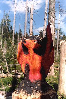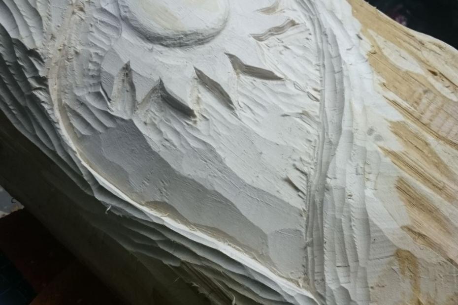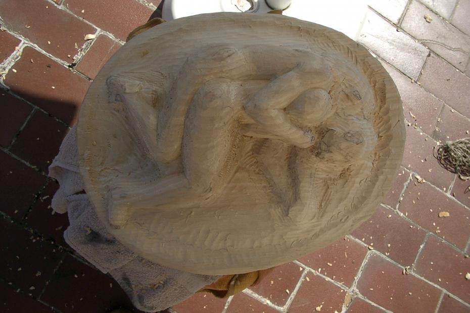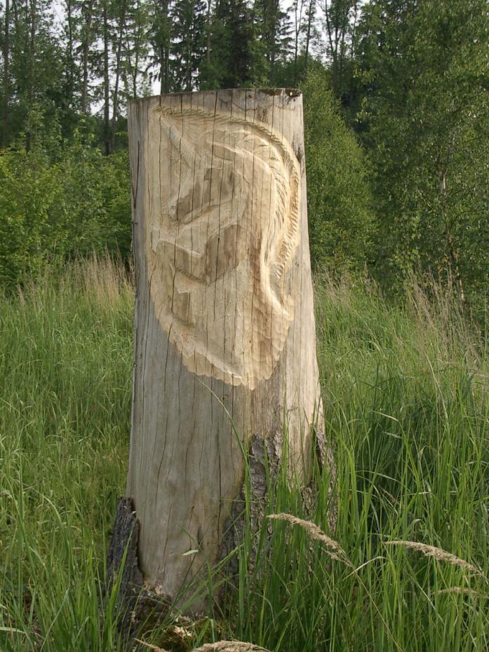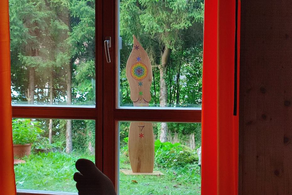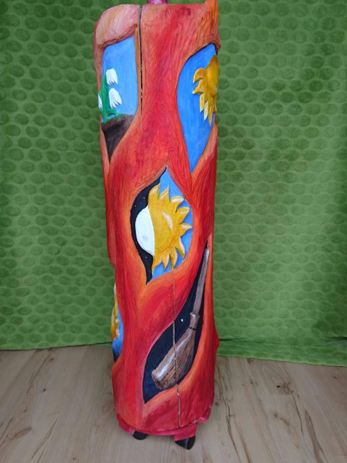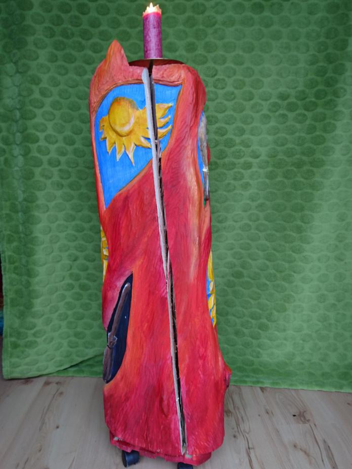 Dann wurde mir die Bedeutung des tiefen Risses klar, der rechts der Sommersonnwend bis tief in den Stamm hinein reicht: er symbolisiert recht deutlich eine Trennung im Juni 2016. Das Johannifeuer am 21.06.16 am Hintersee hat meinen vorangegangen Lebensabschnitt transformiert. Ich erkannte nun diese Krise als feurigen Übergang in eine neue Lebensphase. So erscheint mir diese Skulptur wie der Phoenix aus der Asche, der im wärmenden Feuer zu neuem Leben erwacht.