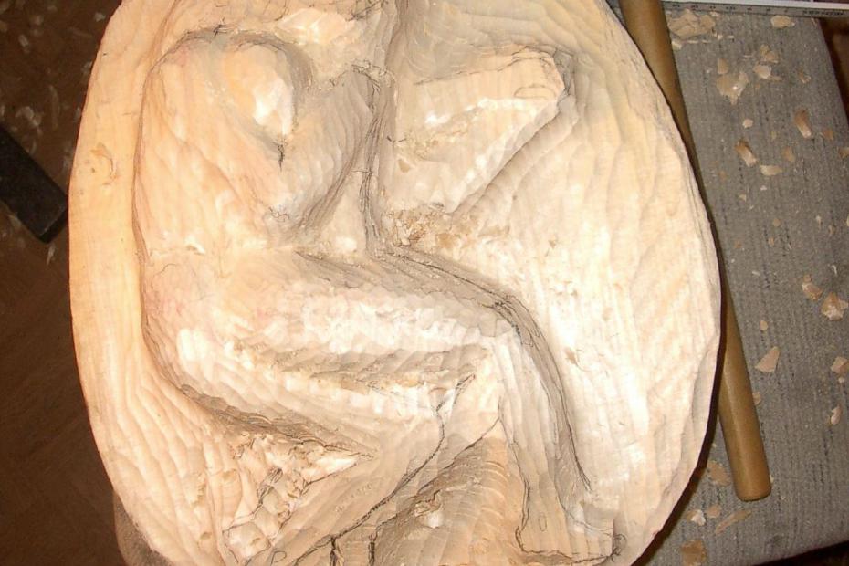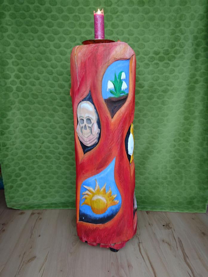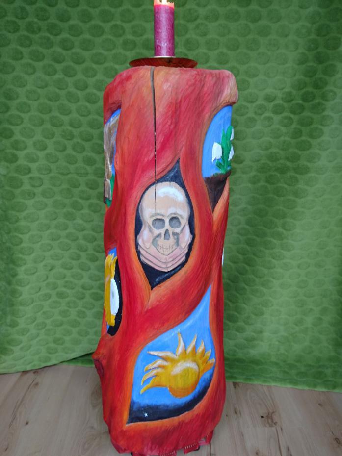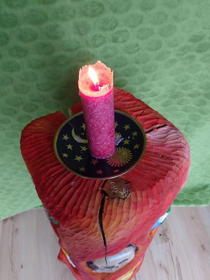 Dieser wunderbar duftende Lindenholzstamm inspirierte mich zu dieser Skulptur, die jetzt als Kerzenständer für ganz besondere Jahreskreis-Kräuterkerzen dient. Acht symbolische Reliefs zieren den Stamm.