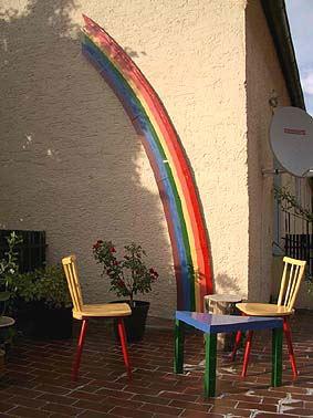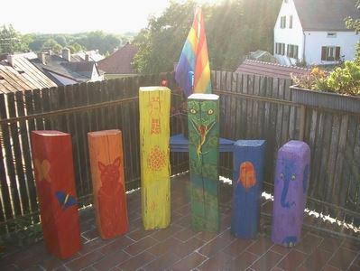 Höhe der Skulptur: 160 cm, Acrylfarben, Bootslack.