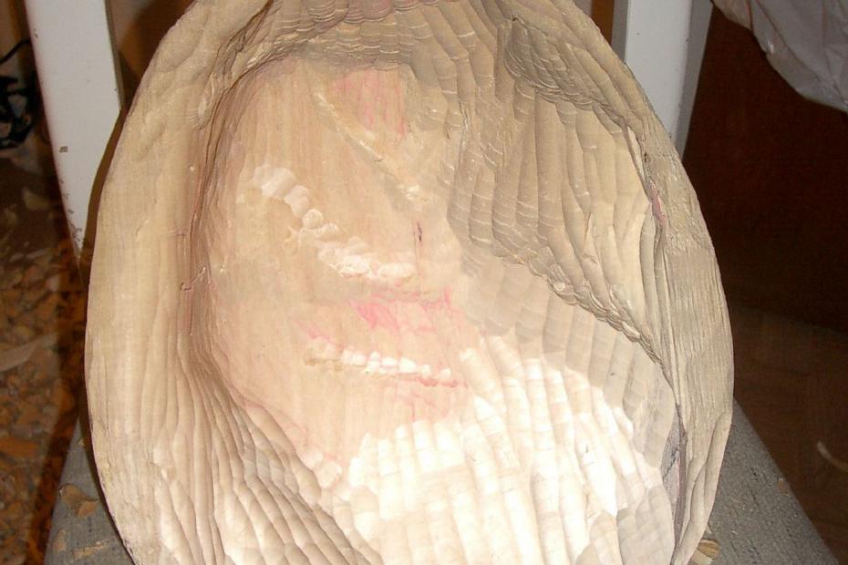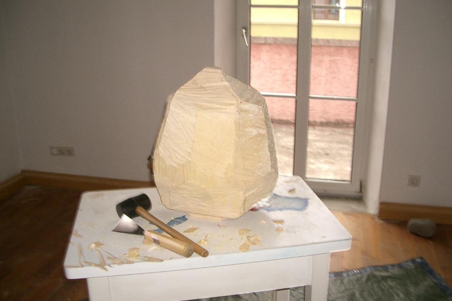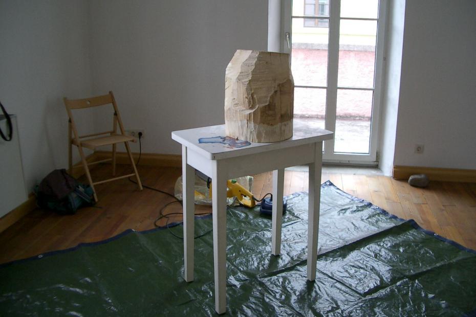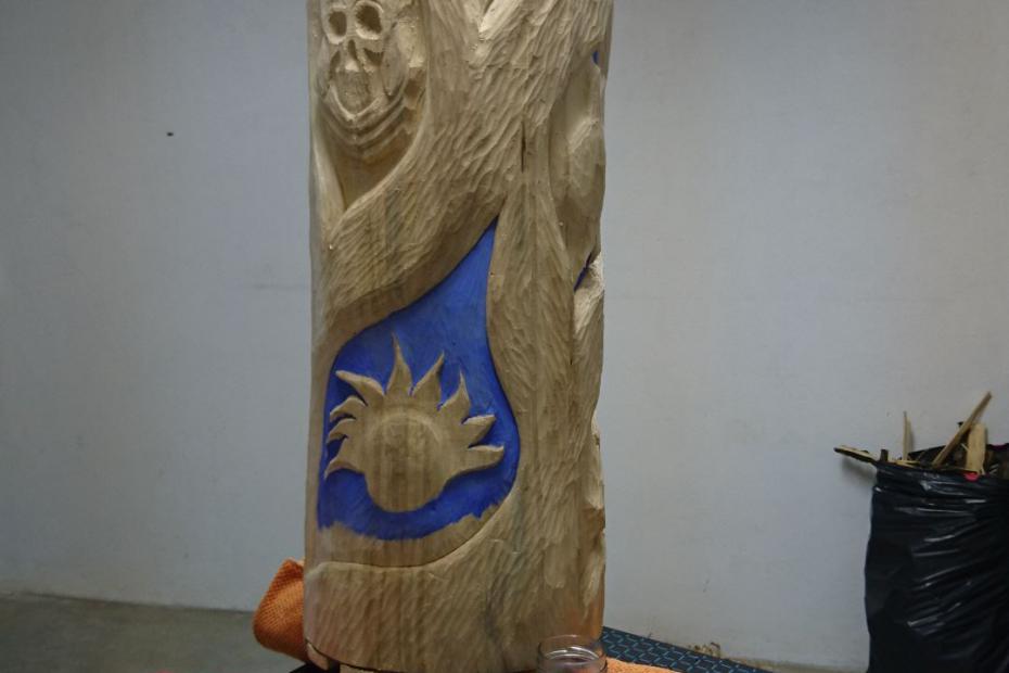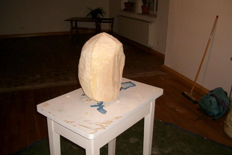 Lindenholz, 1 Meter hoch, Acrylfarben, 28 Kilogramm (anfangs 46 kg)