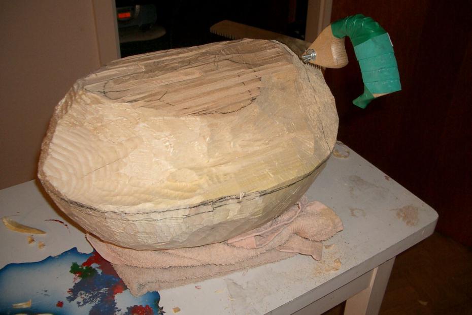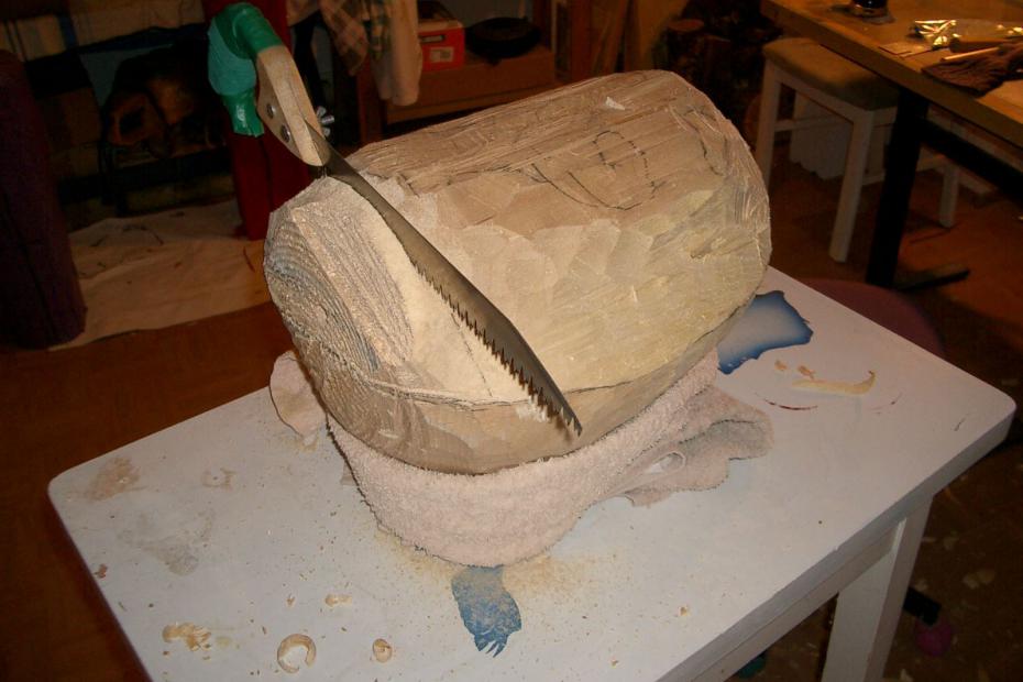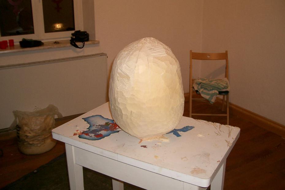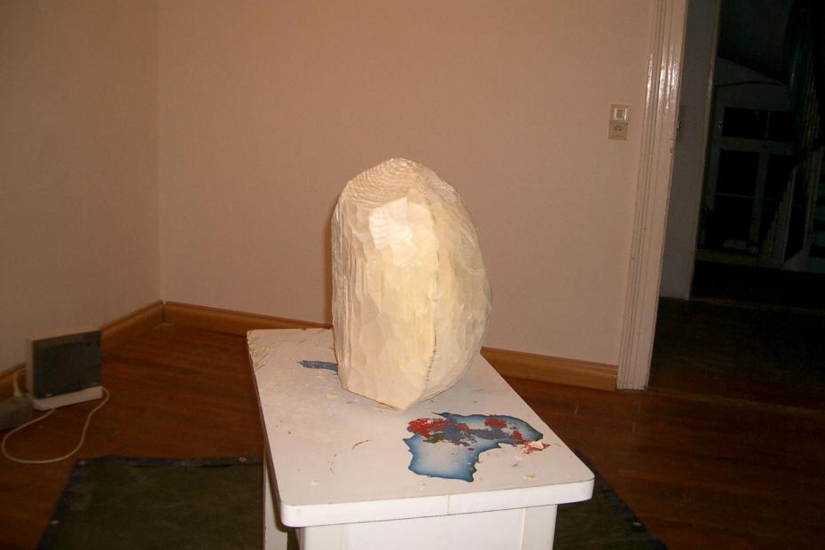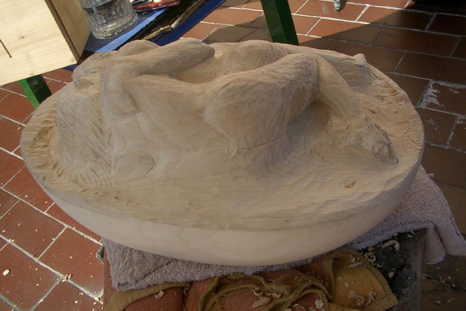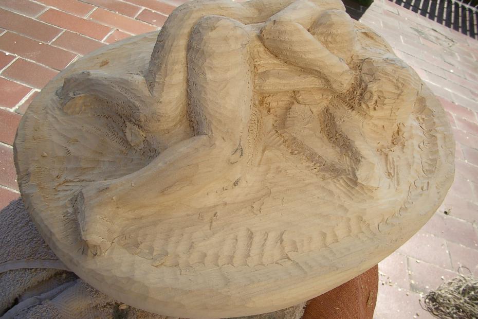 Lindenholz, 1 Meter hoch, Acrylfarben, 28 Kilogramm (anfangs 46 kg)