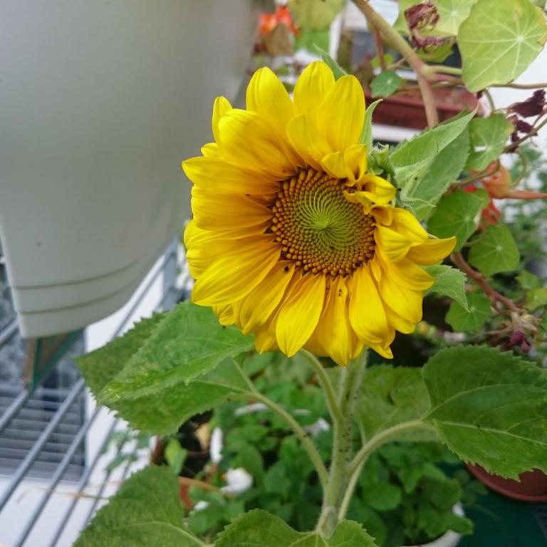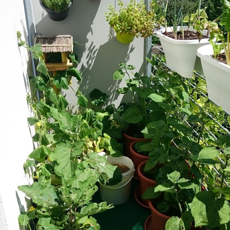 Alles wächst und gedeiht. Einmal habe ich zwischendurch mit selbstgemachter Brennesseljauche gedüngt. Der Deckel auf dem Erdtopf (manche würden es zweckentfremden und als Regentonne verwenden...) dient auch als Tränke für Vögel und Insekten.