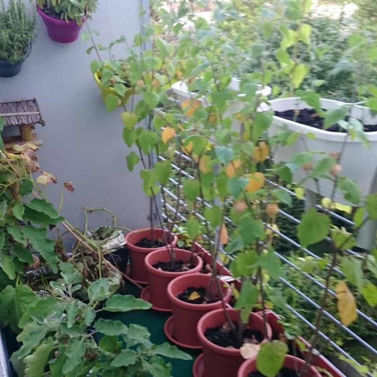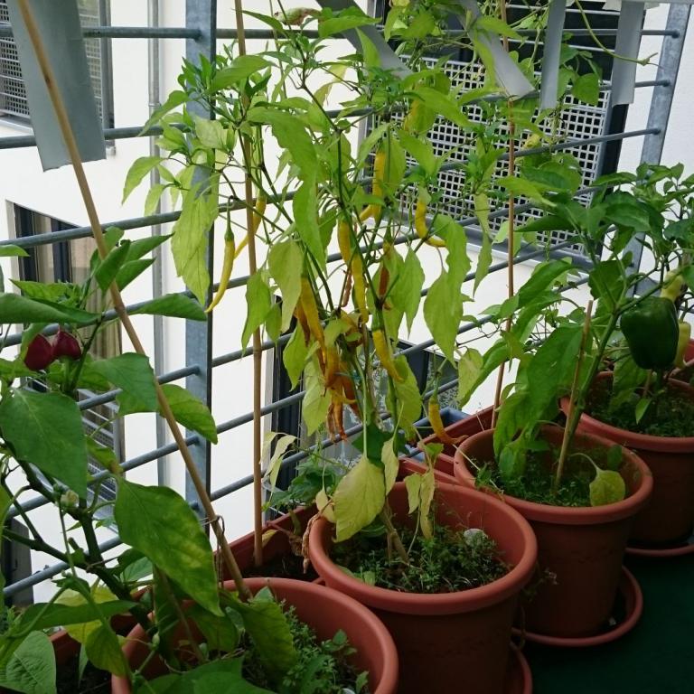 In 2018 habe ich 25 essbare Sorten geerntet: Salbei, Rosmarin, Zitronenmelisse (die drei sind die einzig gekauften Pflanzen), Radieschen, Pflücksalat, Ruccola, Spinat, Mangold, Walderdbeeren, Frühlingszwiebel, Rote Zwiebel, Lauch, Karotten, Gurken, Stangenbohnen, Paprika Frühzauber, Peperoni Sweet Banana, Chili Elefantenrüssel, Rote Beete, Knoblauch, Physalis, Tomaten, Kapuzinerkresse, Buschbohnen und Kartoffeln, sowie ein Bonuskasten mit Schmetterlings- und Bienenblumen.