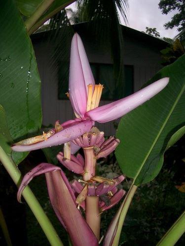 Direkt neben meiner Hütte wuchs dieses Bananenpflänzchen und diese kleinen violetten Stengel, die hier in Fünferreihen am Stamm entlang nach oben wachsen sind Bananen im Babystadium.